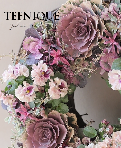 バラのような気品のあるアンティークカラーのハボタンをリズミカルに配置しました♪