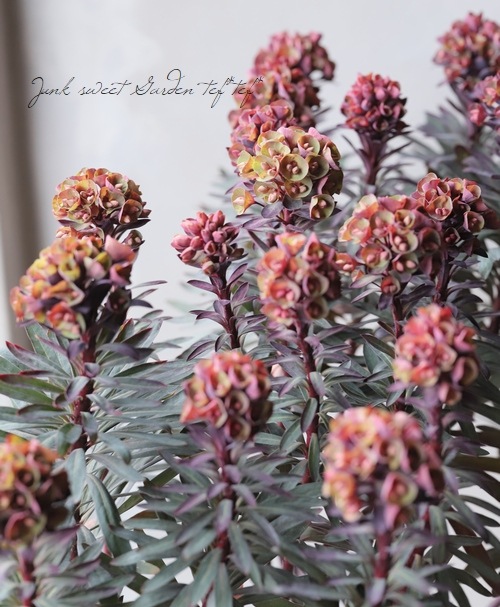 茎は赤く花はライムグリーン〜赤みがかった色へと変化があり、ブロンズかかった葉の新葉は赤みがかり、