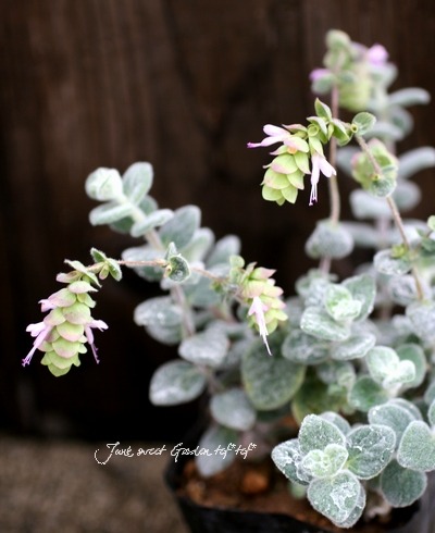 有毛で銀色丸葉のオレガノでピンク花を付けます。